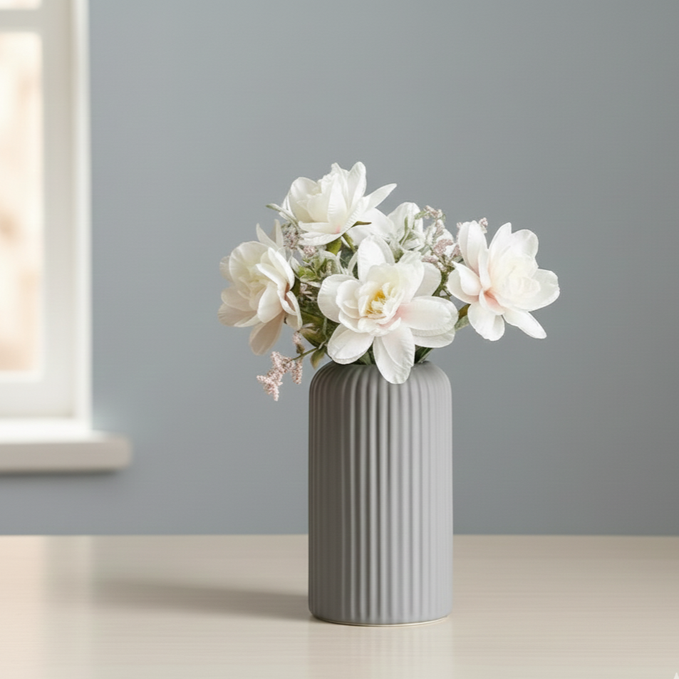 The Slate Grey Fluted Ceramic Vase is a timeless addition to minimalist and modern Indian homes. Its neutral grey tone and soft fluted texture make it a versatile flower vase that complements contemporary décor styles. Perfect for coffee tables, shelves, or office spaces, this ceramic vase adds subtle elegance without overpowering the space.